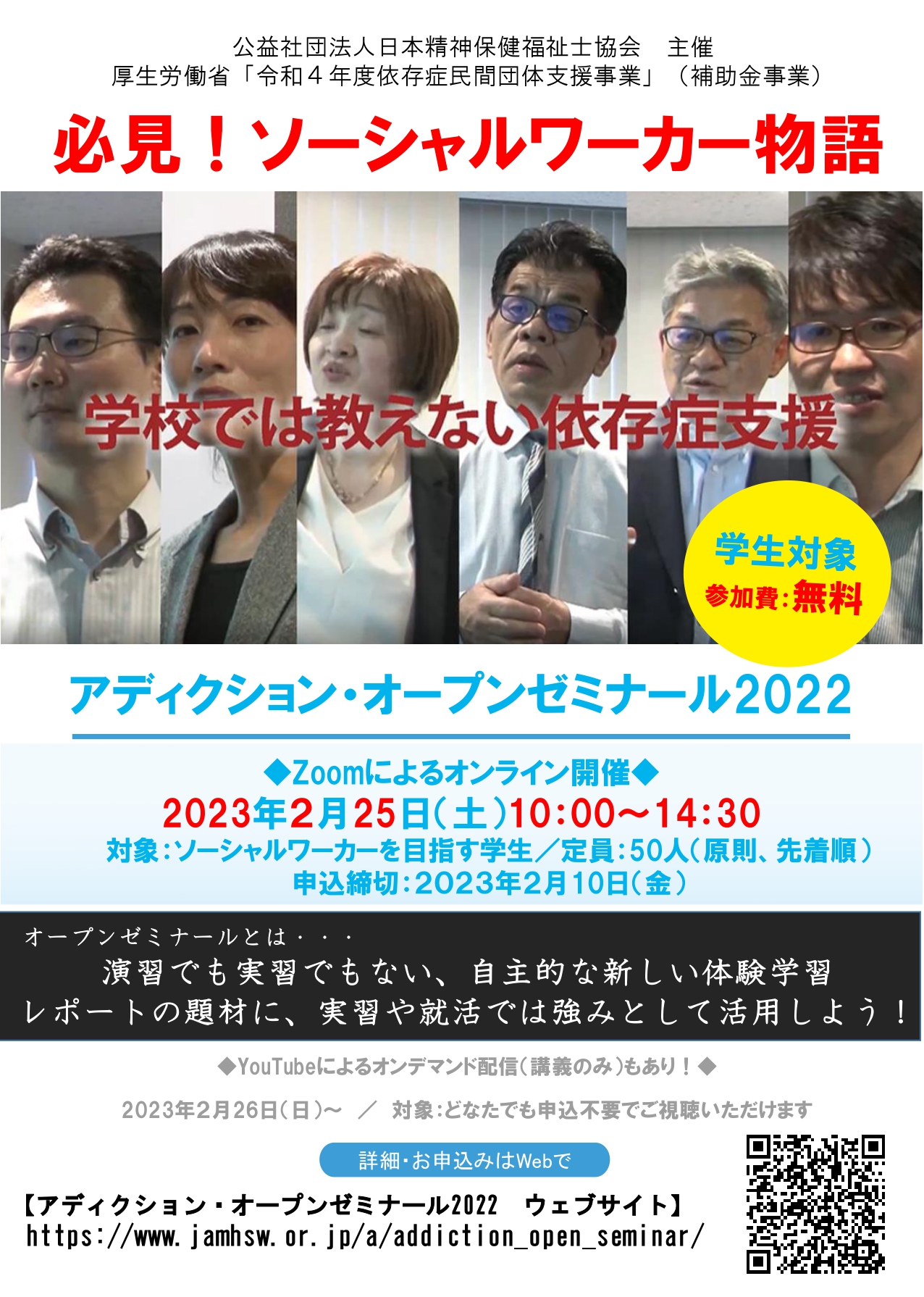 | 10:00−11:30 | 90分 | 開会・オリエンテーション 1.オンライン講義「ソーシャルワーカー物語」(10分×5本) <導入編>「依存症を学ぶメリット〜依存症支援スキルがチートすぎる件〜」 講師:中島 宗幸(堺市 精神保健課) <ケースワーク編>「依存症を抱えるクライエント〜出会い、かかわりからの学び〜」 講師:菰口 陽明(独立行政法人国立病院機構 呉医療センター) <グループワーク編>「依存症支援のおもしろさ〜仲間との出会い〜」 講師:岡村 真紀(医療法人信和会 高嶺病院) <家族支援編>「依存症と家族〜人が人らしく人と共に生きる暮らしを支えたい〜」 講師:小関 清之(医療法人斗南会 秋野病院) <自助グループ編>「依存症者との私の一つの出会い 〜私の成長を支え続けてくれたもの〜」 講師:関口 暁雄(埼玉県済生会 鴻巣医療福祉センター) 2.オンライン講義「アルコール依存症とソーシャルワーク〜教科書には出てこない依存症の知識と実際〜」(30分) 講師:山本 由紀(国際医療福祉大学、遠藤嗜癖問題相談室) |