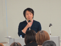 | 実践報告をする松田講師 | 会場の様子 | 演習の様子 | 代表者による修了証書授与 |